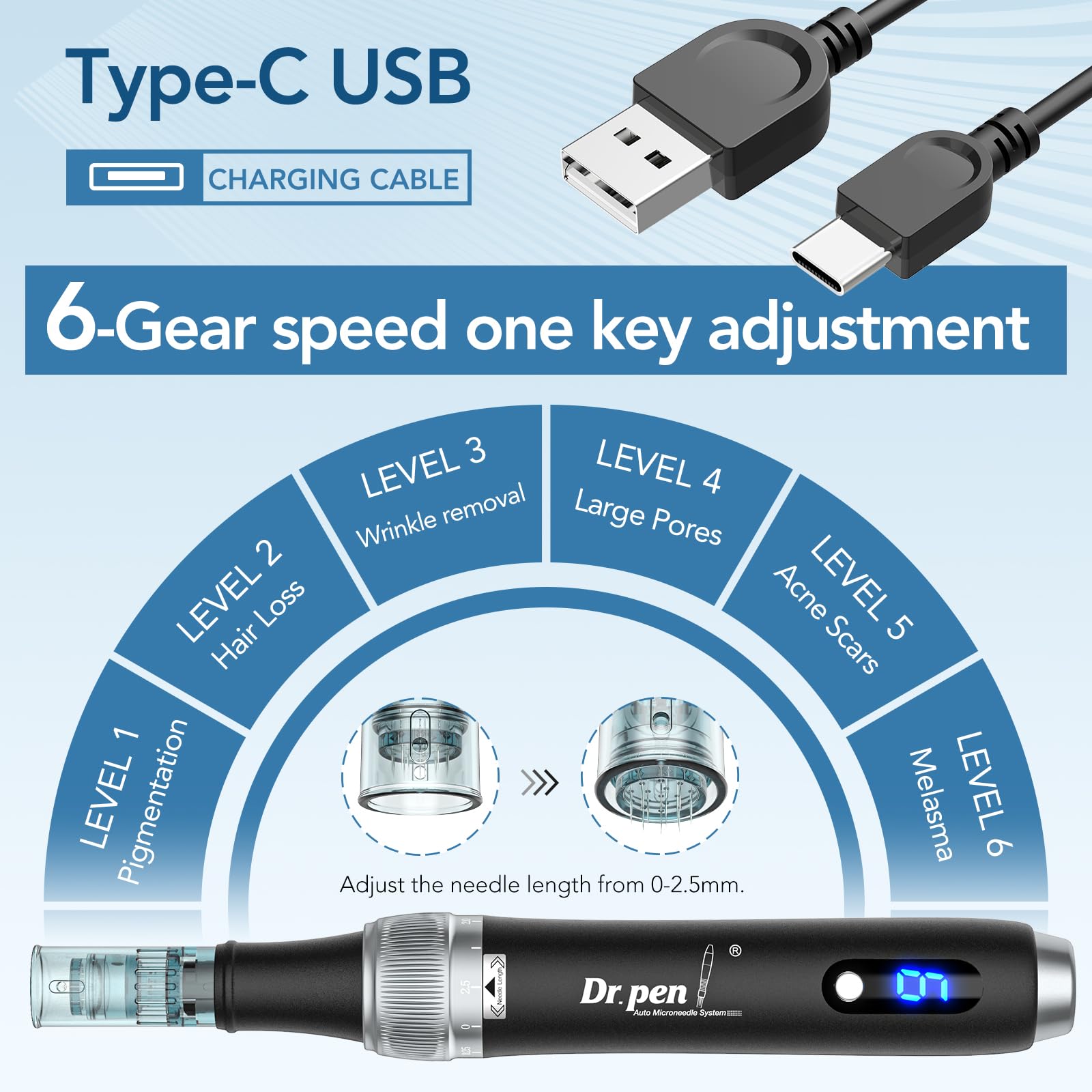 Our original Dr. Pen M7S microneedling pen, developed to the highest US standards, with a powerful motor, 6 speeds, a power indicator, a Type-C cable and a high-quality storage box. Can be used with or without cables to meet your different needs.